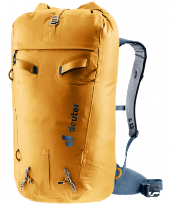 The hard-wearing material, taped and welded seams, and TPU-coated, lapped zippers, combined with a roll-top lid ensure no moisture will penetrate this waterproof mountaineering backpack. Cleverly positioned attachment loops and hip fins that stow away at the sides also contribute not only to the outstanding comfort-to-weight ratio but also allows alpinists to wear it with a climbing harness, making this a very adaptable pack.
