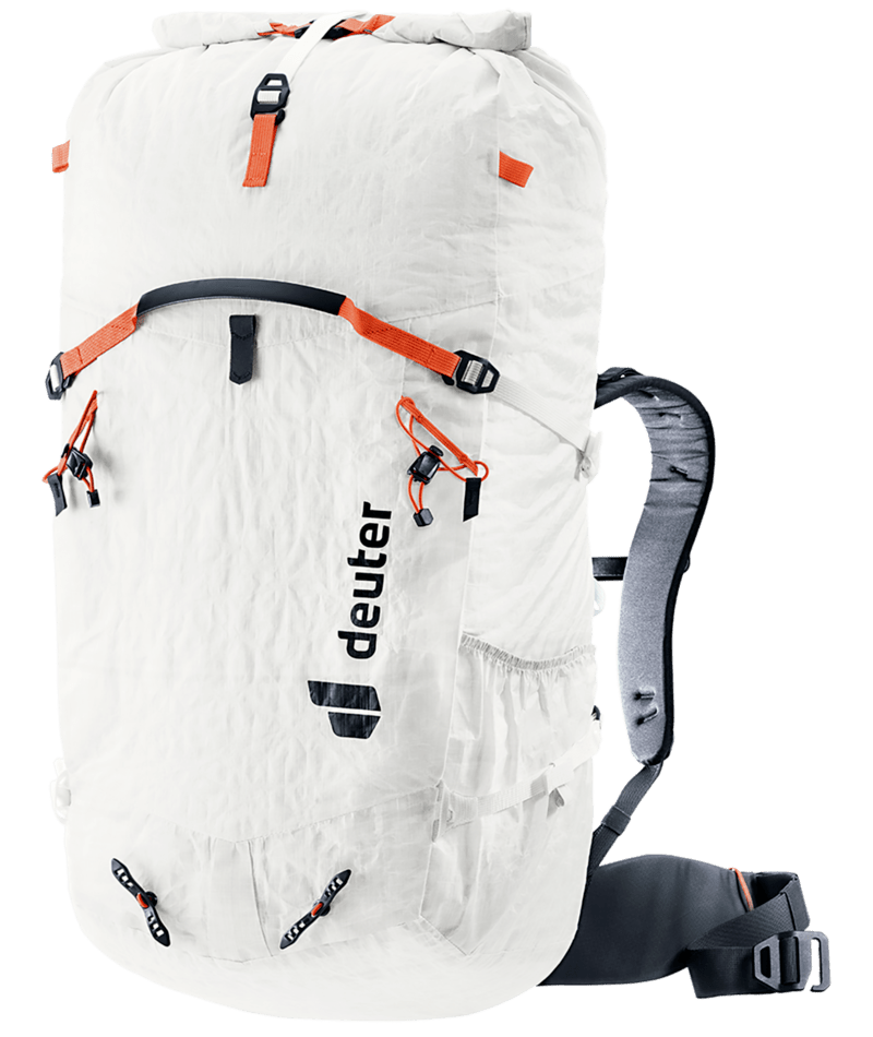 This ultralight expedition mountaineering backpack in tough, ripstop Dyneema(R) fabric delivers excellent carrying comfort at minimal weight. Its deuter Alpine back system with flexi spring steel frame distributes the load evenly. The roll-top opening is accessible when wearing gloves, and unbreakable steel buckles, a detachable rope strap, and side compression straps all combine to offer top functionality and quick handling for moving through challenging terrain.