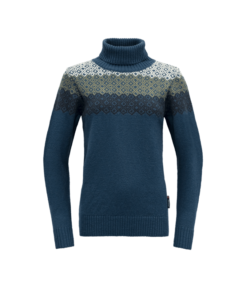 The Devold Syvde sweater is a beautiful knitted sweater in 100% Norwegian wool. The unique Devold pattern is found in the upper part of the sweater, giving the knit a feminine look. The soft knit is created with light and fine wool fibres, with a high neck rib-knit, and rib-knit on the cuffs. Fits perfectly over a Devold baselayer. High nick rib-knit Rib-knit on cuffs – 100% pure new wool from Norwegian sheep. – Comfortable, regular fit. – 7 gauge