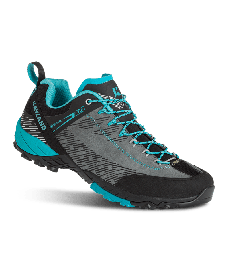 Kayland’s new low-cut shoe, designed for fast hikes at medium altitudes on varied terrain. Lightweight and protective, Revolt features a suede upper and synthetic inserts. The real innovation of the shoe is the direct lamination of the Gore-Tex Invisible Fit membrane onto the upper: Revolt is the first shoe ever to have this process integrated into the leather. Direct lamination ensures that all creases and wrinkles are eliminated, thus reducing pressure points and ensuring a perfect fit. The construction technique helps reduce shoe weight, cut down water absorption and speed up drying times. The lacing system comprises a webbing of laces that tighten the upper to provide enhanced comfort and precision.